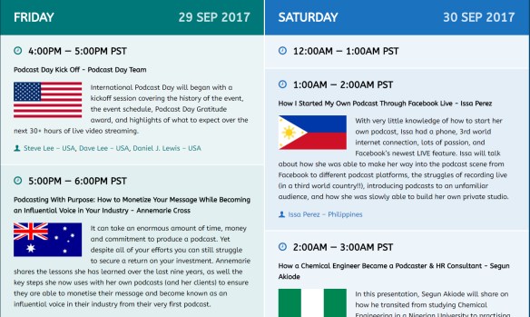 I’ve been given the 1:00 AM- 2:00 AM PST time slot which is 4:00 PM Saturday, in Philippines and I will be talking about how I started my own podcast through Facebook live.